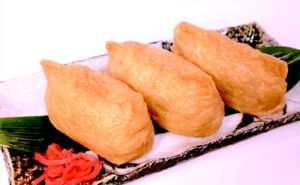 A type of sushi in which sweet and spicy fried tofu is stuffed with vinegared rice. It is also called Oinari-san”, “Oinari”, or “Inari”.