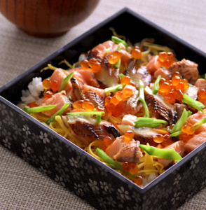 ちらし寿司 "Chirashizushi" sushi rice in a box or bowl with a variety of ingredients sprinkled on top