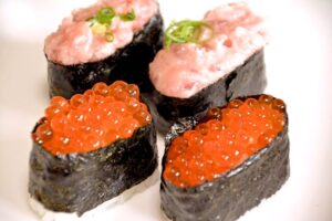 Gunkanmaki is sushi made by wrapping vinegared rice with seaweed and placing sushi seeds on top of it. It was named because its appearance resembles a warship. It is characterized by being able to provide small, easily deformed items such as salmon roe, sea urchin, whitefish, negitoro, and tobiko.