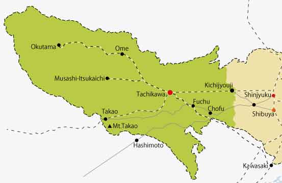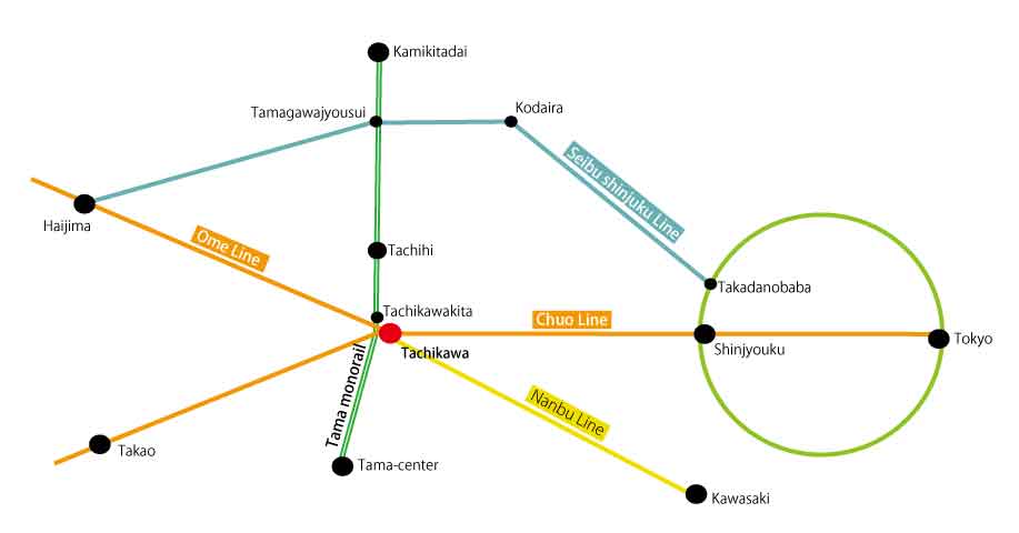 Tachikawa City is located in the center and west of Tokyo. JR Tachikawa Station, the gateway to the city, is a major transportation hub, served by the Chuo Line, Ome Line, Itsukaichi Line, and Nambu Line, as well as the Tama Monorail, which connects the Tama area from north to south, and extensive bus routes connecting to the surrounding cities. The area surrounding the station is the busiest in the Tama region, with a concentration of large commercial facilities including department stores, office buildings, and a wide variety of restaurants.